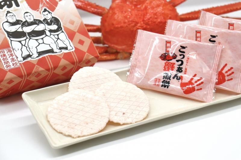 相撲のまち糸魚川。多くの力士たちがこのまちで育ちました。先輩を追って相撲道に励む新潟海洋高校相撲部が縁起菓子「ごっつぁん蟹煎餅」を開発しました。相撲部のお祝い事で振る舞われる日本海の紅ずわい蟹。高校生力士たちは海の恵みで力をつけ、日々稽古に励んでいます。